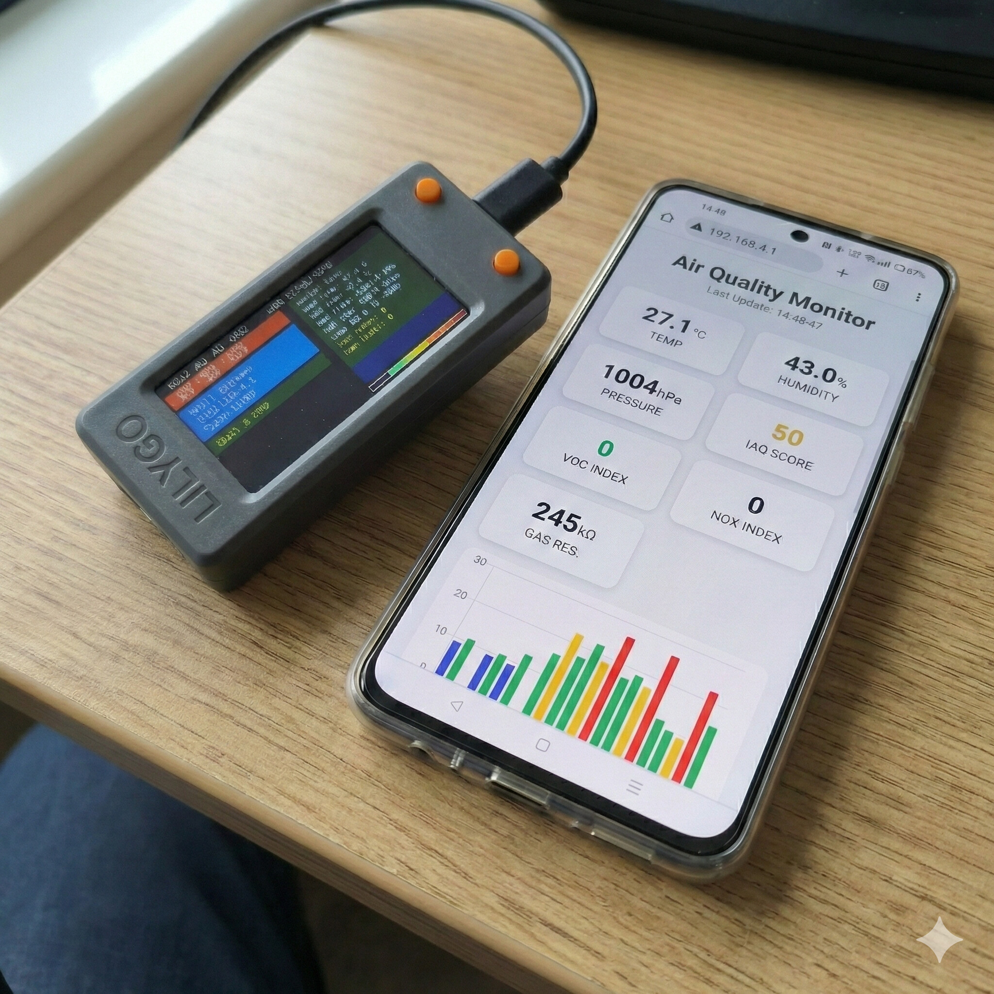 What you build: A complete environmental monitoring system using ESP32 T-Display and BME680 sensor, capable of measuring temperature, humidity, barometric pressure, and air quality (VOC/gas detection). The device operates standalone or connects to WiFi, publishes data via MQTT, and includes a web dashboard accessible from any browser on your network.